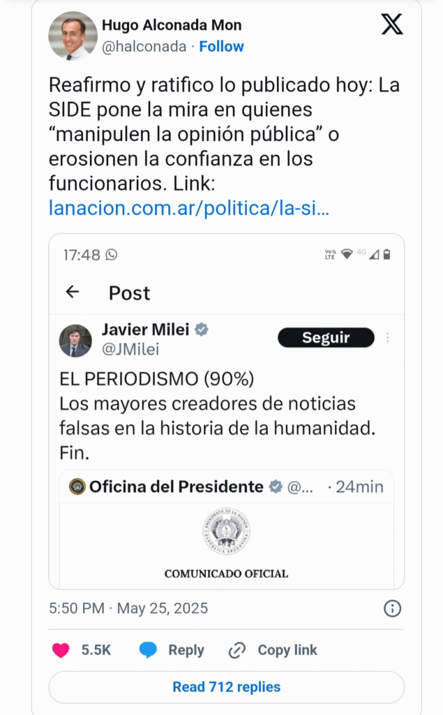 El propio Javier Milei replicó el artículo desde su cuenta, acusando a todos los periodistas de ser mentirosos. Ante esto, Alconada respondió: “Reafirmo y ratifico lo publicado hoy: la SIDE pone la mira en quienes ‘manipulen la opinión pública’ o erosionen la confianza en los funcionarios”, remarcando su postura.