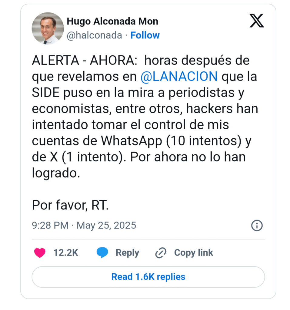 La información fue publicada por Alconada, quien horas después, mediante su cuenta de X, escribió: “Horas después de que revelamos en LA NACIÓN que la SIDE puso en la mira a periodistas y economistas, entre otros, hackers han intentado tomar el control de mis cuentas de WhatsApp (10 intentos) y de X (1 intento). Por ahora no lo han logrado”.