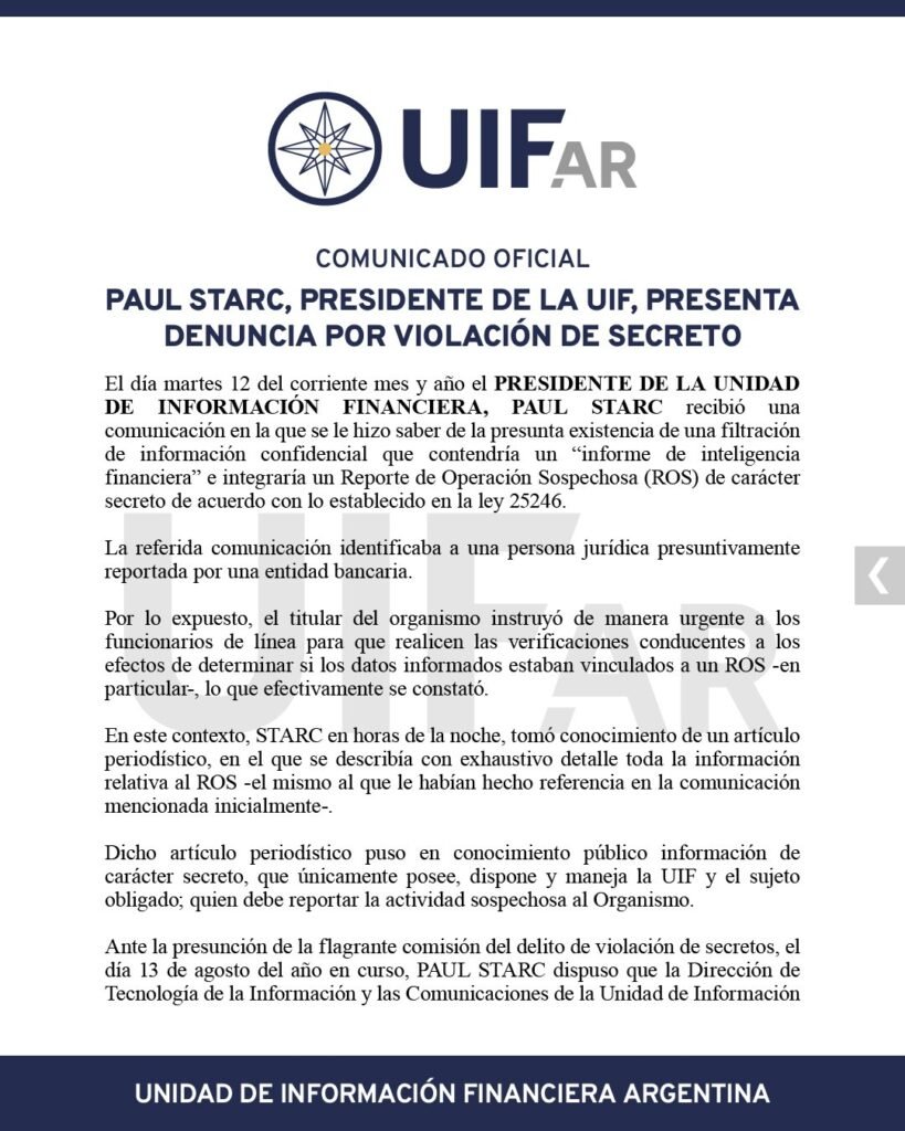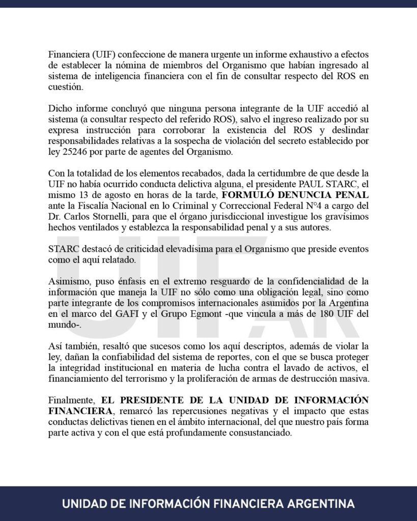 Starc también ordenó que la Dirección de Tecnología de la Información y las Comunicaciones del organismo elabore un relevamiento sobre los accesos internos al sistema. “Ninguna persona integrante de la UIF accedió al sistema, salvo el ingreso realizado por expresa instrucción para corroborar la existencia del ROS”, concluyó el informe interno, deslindando responsabilidades sobre posibles violaciones al secreto.