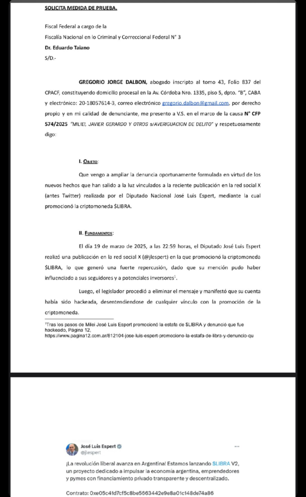 Dalbón hizo la presentación ante el fiscal Eduardo Taiano quien tiene delegada la causa tras la denuncia por la promoción que Milei hizo de la esa moneda digital provocando una enorme aumento en su cotización, antes de que se desmoronara estrepitosamente.