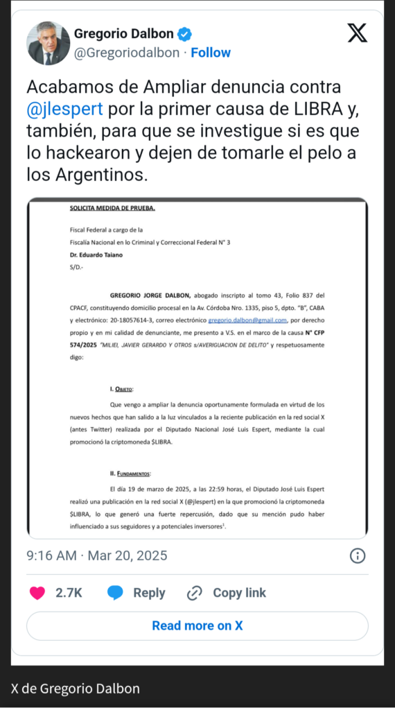 El abogado Gregorio Dalbón pidió que se investigue al diputado nacional José Luis Espert en la causa del escándalo $Libra por la que se denunció al presidente Javier Milei, para que se determine si fue parte de la estafa o si su teléfono fue hackeado como dijo el legislador.