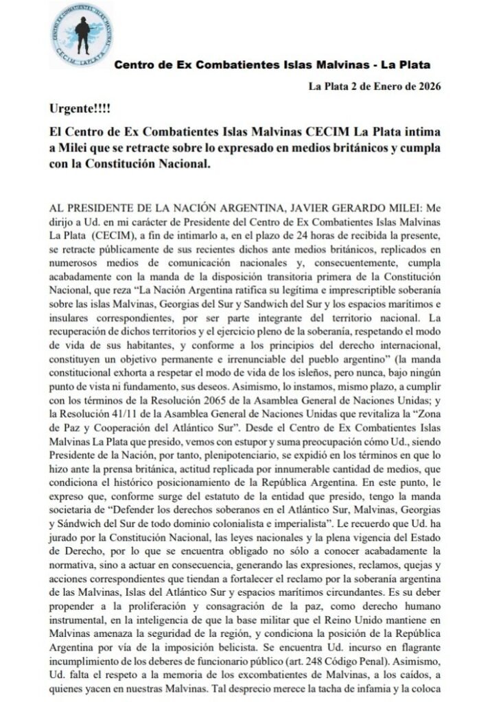 El Centro de Ex Combatientes Islas Malvinas (CECIM) de La Plata presentó una intimación formal contra el presidente Javier Milei a raíz de declaraciones realizadas en medios del Reino Unido sobre la cuestión Malvinas. La organización le exigió que se retracte públicamente en un plazo de 24 horas y que ajuste su accionar y sus palabras a lo establecido por la Constitución Nacional, al considerar que sus dichos afectan el reclamo histórico de soberanía de la Argentina sobre las islas.