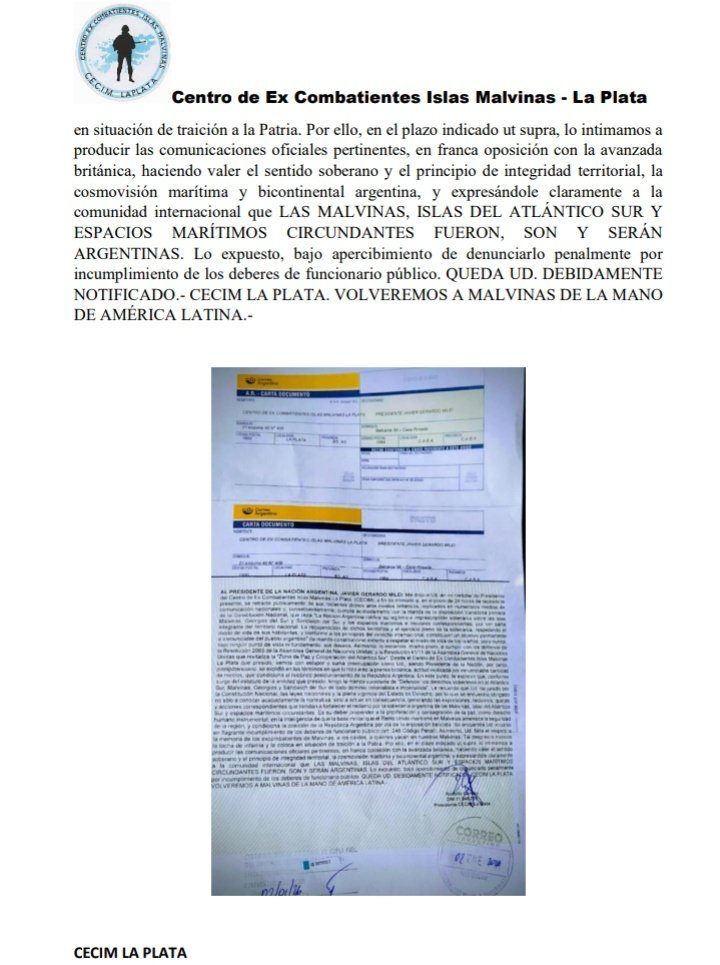 El Centro de Ex Combatientes Islas Malvinas La Plata (CECIM) interpuso una intimación formal contra el presidente Javier Milei, luego que este afirmara que las islas volverán a ser argentinas cuando lo decidan los kelpers.