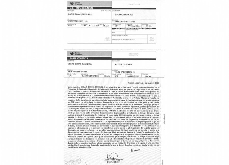 Según consta en la intimación formal, Ruggiero denuncia que el fallecido secretario general Humberto Bertinat fue quien habría vendido en septiembre de 2021 (en plena pandemia de Covid-19), un inmueble perteneciente al Sindicato de Obreros y Empleados Municipales de Junín, el cual se encontraba escriturado a nombre de la Federación provincial.