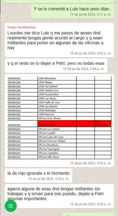 La filtración de una serie de chats entre la legisladora y el funcionario de la Secretaría General de la Presidencia Diego Vartabedian, dejan muy en claro que las decisiones últimas de los aspirantes a funcionarios propuestos por los dos mendocinos -uno ministro, otra diputada- eran de Lule Menem, que definía a qué organismo y de qué localidad iba a ir cada candidato a un puesto en el Estado.