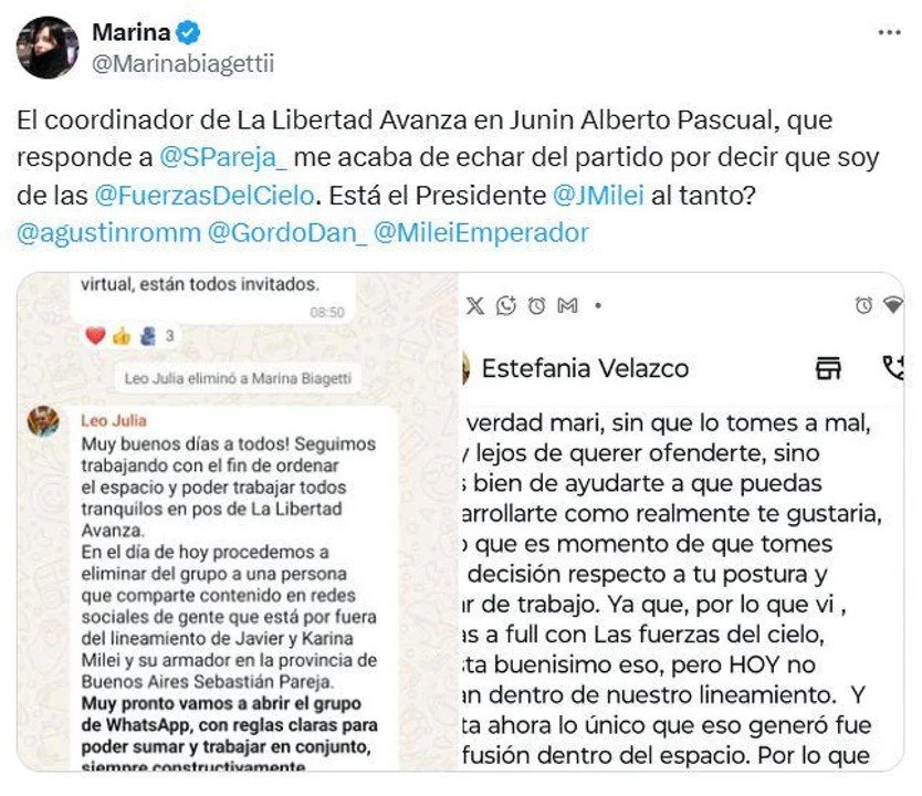 En Junín, Alberto Pascual, titular de PAMI y coordinador de LLA, fue removido tras un conflicto con la influencer libertaria Marina Biagetti, que responde a Santiago Caputo. La mujer que milita en “Las Fuerzas del Cielo”, reclamó la intervención del “Gordo Dan” para dirimir el asunto y éste, a su vez, hizo público el pedido del asesor estrella con pocas pulgas.