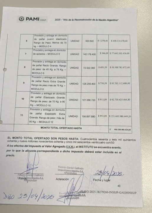 Como ejemplo de sobreprecios puede verse en la misma acta de apertura, donde en el segundo ítem aparecen los apósitos a precio unitario de 546.09 pesos en abril de 2025 y de los que deben comprarse 142 millones. El sobreprecio es tal que seis meses después, esos mismos insumos se encuentran a 290 pesos en cualquier supermercado, farmacia o droguería y en costo minorista. La diferencia entre lo que PAMI compró a Urbano, y lo que podría haber comprado a cualquier distribuidor solo googleando, significa un costo por encima de treinta mil millones de pesos, que es fácil prever en qué bolsillos se perdieron.