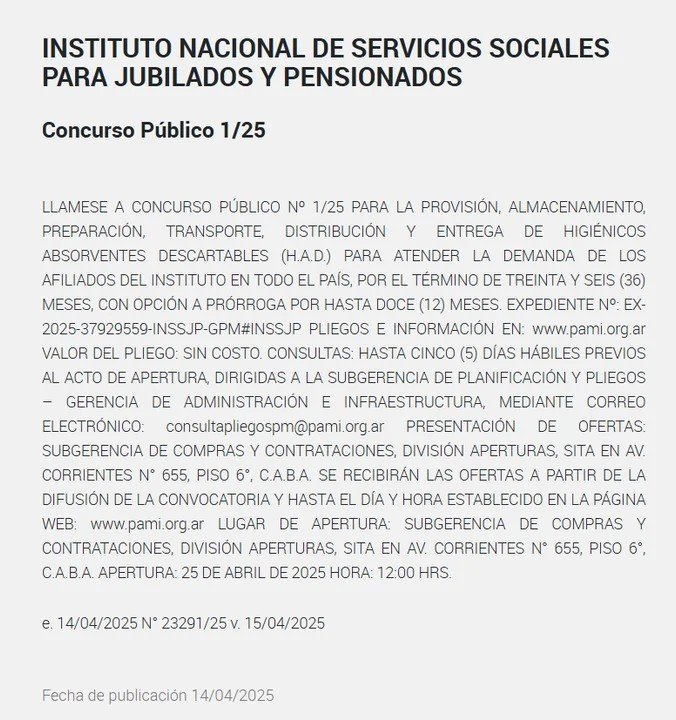 El llamado a licitación para la provisión de pañales y apósitos para adultos se hizo el 14 de abril de 2025 y se publicó en el Boletín Oficial. El texto dice: