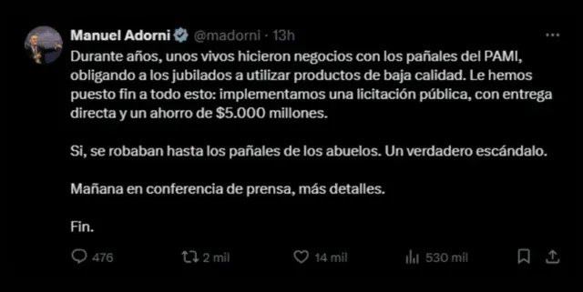 El portavoz apuntó también contra la gestión anterior y afirmó que “se robaban hasta los pañales de los abuelos”. “Le hemos puesto fin a todo esto: implementamos una licitación pública, con entrega directa y un ahorro de $5.000 millones. Sí, se robaban hasta los pañales de los abuelos. Un verdadero escándalo. Mañana en conferencia de prensa, más detalles”.