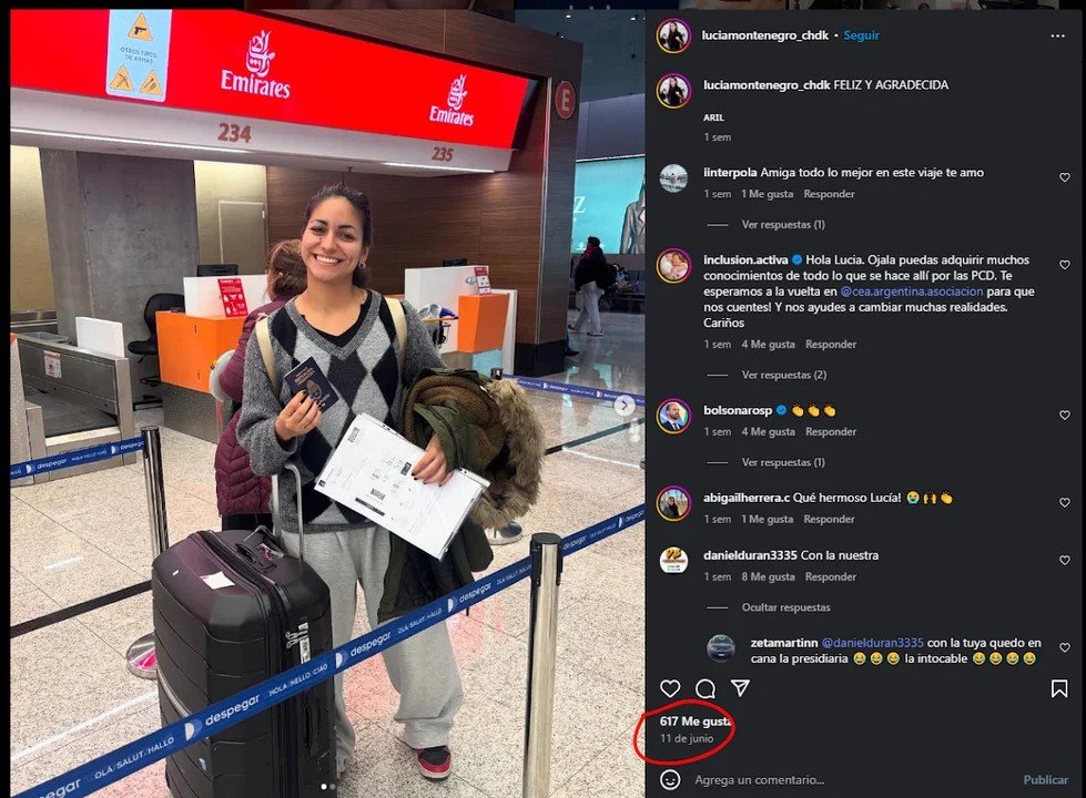 También en su Instagram muestra que está abordando un avión de Emirates Líneas Aéreas en Ezeiza el miércoles 11, por lo que si el 13 la encontró en Dubai esperando ir a Tel Aviv, se desprende que de Argentina voló a la meca del lujo oriental, de donde regresó a Argentina el lunes 16. La pregunta es: ¿A qué fue Lucía Montenegro a Dubai por cinco días, y sin pisar Tel Aviv como se supone tenía previsto?.
