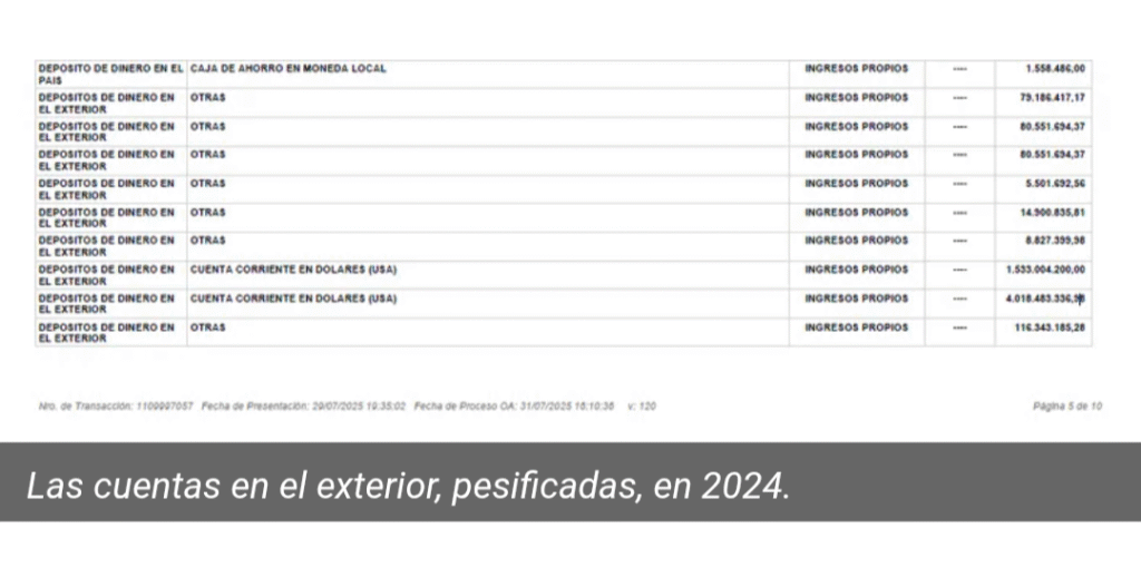 Según su última presentación, Caputo cerró 2024 con u$s 5.753.246. En esta ocasión, sí aclaró que mantiene dos cuentas corrientes en Estados Unidos. Precisamente son las que contienen la mayor cantidad de esos fondos: en una de ellas consignó que tenía $1.533.004.200 (casi u$s 1,5 millones a un dólar de $ 1.035) y en otra, $4.018.483.336 (más de u$s 3,8 millones).