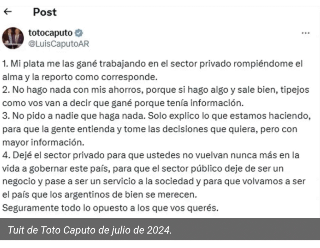 A diferencia de la época de Cambiemos, cuando Mauricio Macri repatrió unos fondos que tenía en el Merrill Lynch como señal de confianza en su modelo económico, pasos que el exministro de Economía, Nicolás Dujovne, siguió a medias, la administración libertaria se jacta de mantener su patrimonio dolarizado. El propio Caputo cruzó, el año pasado, al periodista Ari Lijalad en Twitter por sus cuentas en el exterior: “Mi plata me la gané trabajando en el sector privado, rompiéndome el alma, y la reporto como corresponde”.