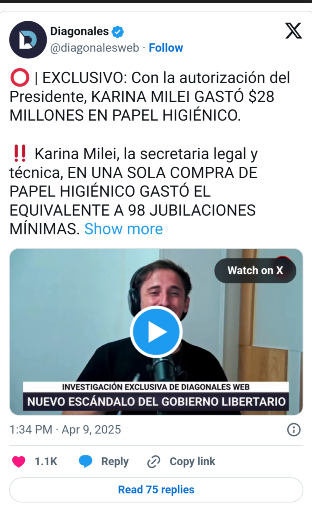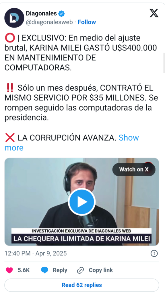 Diagonales descubrió fuertes irregularidades en las licitaciones del último semestre de la hermana de Javier Milei. El festival de compras incluye un service de PC por casi 400 mil dólares, cifras millonarias por papel higiénico, operaciones al triple del valor de mercado y más de $1,6 billones despilfarrados en pleno ¿ajuste?