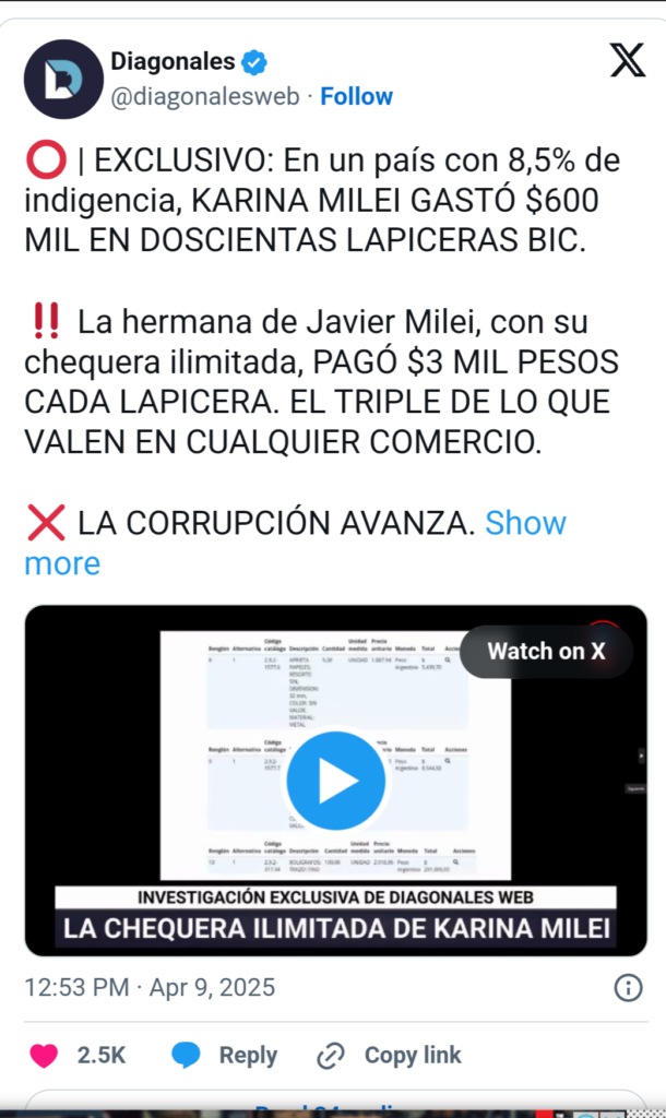 El descubrimiento de las dos órdenes de compra idénticas distanciadas por 36 días y con un pozo acumulado que supera el medio billón de pesos inspiró a Diagonales a realizar una investigación pormenorizada de los movimientos de la hermana presidencial en el último semestre. Y lo que el informe descubrió resulta, cuanto menos, escandaloso: contrataciones sin licitación, operaciones por montos alucinantes, adquisiciones insólitas, sobreprecios que triplican el valor de mercado de los productos y, en general, una oda al despilfarro que contrasta con la “motosierra” de Milei y acumula, a lo largo de 12 polémicas operaciones, un gasto de más de $1.667.000.000 costeado exclusivamente con la tuya.