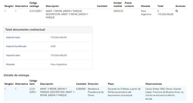 Pues bien: resulta que la “chequera” de Karina vivió unos días de altísima actividad por aquella época. El mismo 19 de febrero, el Gobierno Nacional terminó de cerrar la contratación de un servicio de jardinería para la Quinta de Olivos por unos nada desdeñables $173 millones, a razón de $28 millones por mes, para solucionar por un semestre las tareas de “mantenimiento y reparación del jardín y parque” de la Residencia Presidencial. Nueve días después concluyó una segunda operación de descripción similar, esta vez para la Casa Rosada, por un total de $38 millones, con lo que totaliza unos $211 millones para cortar el pasto en los palacios gubernamentales.