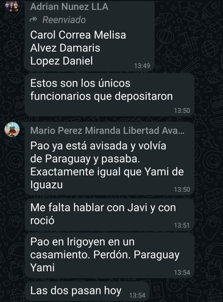 Jove mostró chats que involucran los nombres de Melisa Carol Correa, Damaris Alvez y Daniel López como “los únicos funcionarios que depositaron”, mientras que luego un tal Mario Pérez Miranda aseguró que “Pao ya está avisada, volvía de Paraguay y pasaba. Exactamente igual que Yami de Iguazú”.