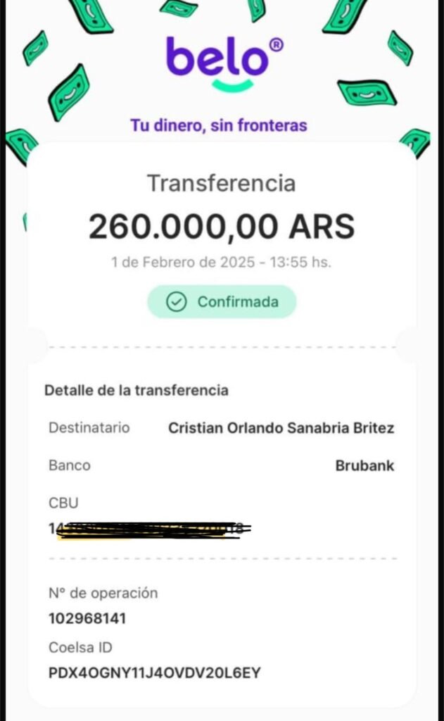 Además, el periodista mostró un comprobante de una transferencia por un valor de 260.000 pesos argentinos, que tienen como destinatario a Cristian Osvaldo Sanabria Britez.