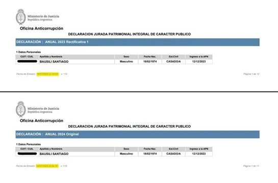 La extraña suba fue revelada por El Destape y llevó al titular del Banco Central a ser denunciado por presunto enriquecimiento ilícito. De acuerdo con la información a disposición del tribunal, el funcionario libertario hizo crecer su riqueza de $364 millones a más de $3.222 millones en un máximo de 24 meses. No obstante, lo más llamativo es que el salto fue declarado recién ahora: el 14 de julio a las 22.04, Bausili presentó su DDJJ de 2024; pero, un minuto antes, a las 22.03, subió una rectificación de su DDJJ de 2023 – siendo mediados de 2025. ¿Error o maniobra deliberada?