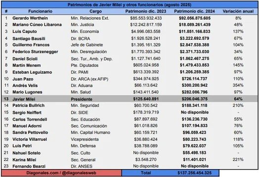 Se mencionó antes el caso de Karina Milei, quien se ubica segunda en la lista con un increíble alza del 221% en doce meses. Completan el podio Bullrich, con su tercer puesto con 210%, y, en primer lugar, nada menos que Andrés Velis, el Director de la Aduana de Milei, cuya riqueza aumentó un 354% en un año -el triple de la inflación registrada durante el período-. Cabe recordar que en ese tiempo la DGA estuvo vinculada con escándalos gigantescos como el de la “valijera” Laura Arrieta y el avión del empresario Leonardo Scatturice, un oscuro exespía de la SIDE contratado por el Gobierno libertario, como develó Diagonales.