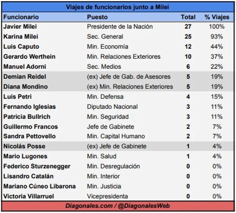 Resulta todo un síntoma que los cancilleres figuren tan abajo en la lista. Combinados, Werthein y su predecesora Diana Mondino apenas suman 15 giras junto al Presidente -casi lo mismo que Caputo y muchísimo menos que la hermanísima Karina-, siendo que su tarea máxima es encargarse de la agenda diplomática nacional. Cabe reiterar que las estadísticas corresponden únicamente a las giras junto al Presidente, y no las que hayan realizado los funcionarios en solitario.