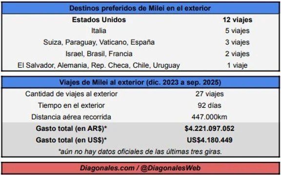 - Solo las primeras cuatro giras se realizaron en aerolíneas comerciales: desde la quinta en adelante, Milei voló exclusivamente en la flota presidencial y en aviones privados, lo que encarece notablemente las travesías. Asimismo, el líder libertario visitó 14 países (cinco de ellos, latinoamericanos), y su destino preferido es Estados Unidos, adonde viajó 12 veces. Los datos surgen de los informes enviados al Congreso por el jefe de Gabinete Guillermo Francos, si bien mostraban errores que fueron completados por Diagonales. Hay capturas adjuntas tanto en este artículo como en las entregas precedentes de junio y julio.