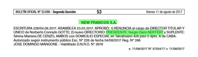 A su vez, el ex funcionario del Consejo Escolar figura en otra empresa: New Francos SA, establecida el 20 de diciembre de 2006, con domicilio fiscal en Talcahuano 426. El directorio de esta firma quedó conformado por Francisco Ángelo Colosimo, como presidente y Neiffert, como director suplente. La prestataria tiene como fin la construcción de edificios, parques industriales, centros y complejos turísticos, obras civiles y militares. También está destinada a la realización de operaciones inmobiliarias, compraventa, permuta, leassing y a otorgar préstamos de capitales a particulares o sociedades por acciones.