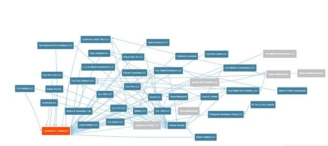 La red de empresas de Scatturice es enorme y comprende más de treinta y cinco solo a su nombre. En algunas de ellas comparte sociedad con su esposa, Pamela Poveda, y con Laura Arrieta, la muchacha conocida como “la valijera”, por su llegada a Buenos Aires en un avión propiedad de Scatturice, que partió de Miami e hizo escala una semana en Argentina, para partir luego hacia París, sin que nadie revisara las valijas que quedaron sobre la aeronave en tránsito, aparentemente por “orden de arriba”.