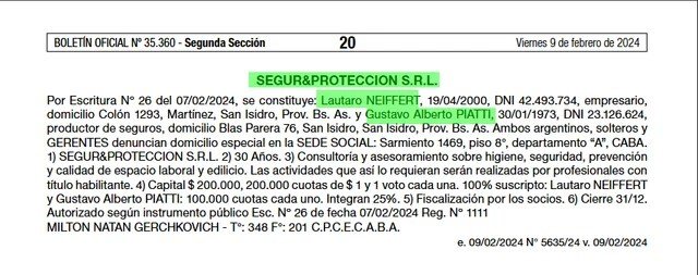 Lautaro Neiffert es el hijo de Sergio, tiene 25 años cumplidos en abril y es titular de la firma Segur&Proteccion Srl. dedicada a la seguridad privada, que se registró el 9 de febrero de 2024, apenas iniciado el gobierno de Milei; en sociedad con Gustavo Piatti.