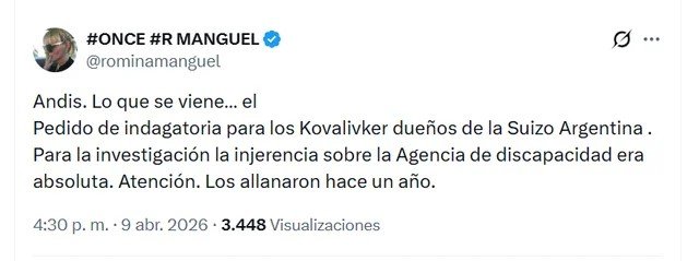 La relacionista es explícita al decir que Kovalivker le dio de mínima 70mil dólares a Andrés Mego para el show del Movistar (además de otra suma para el arreglo de sus dientes rotos tras la golpiza de julio de 2025) y que Mego a su vez conoció al presidente a través de Nicolás Márquez, amigo de ambos. En ese punto de la conversación acota algo trascendente: que tanto ella como el hijo de Kovalivker, no se sabe si Emanuel o Jonathan, lo “bajaron de un hondazo” del acto, porque después de darle el dinero “explotó todo”. Lo que explotó fue la Causa ANDIS, que puso a la Droguería Suizo Argentina y a su familia propietaria en el ojo de la tormenta mediática y de la Justicia.
