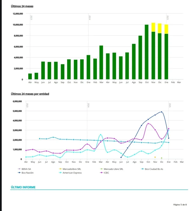 Aunque no registra cheques rechazados ni documentos cuestionados, su perfil financiero muestra un endeudamiento creciente en los últimos meses. Solo en marzo de 2025, su deuda total superaba los $10 millones, con picos de consumo a través de tarjetas de crédito como American Express y ICBC, donde acumuló más de $3.000.000. En Banco Nación, comenzó en junio de 2024 con un gasto de $1.000.000 y en diciembre de dicho año acumuló gastos por $5.000.000, mientras que en el Banco Ciudad mantiene un gasto de $2.000.000 al mes de enero.