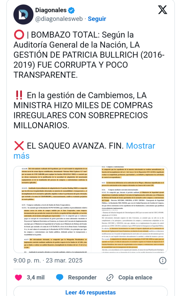 La Auditoría General de la Nación (AGN) reveló un informe demoledor sobre la gestión de Patricia Bullrich al frente del Ministerio de Seguridad durante el gobierno de Mauricio Macri. Los hallazgos detallan un esquema de sobreprecios, compras directas sin licitación y desvío de fondos públicos, con un hilo conductor inquietante: el enriquecimiento súbito de su hijo, Francisco Langieri Bullrich, y su círculo íntimo.