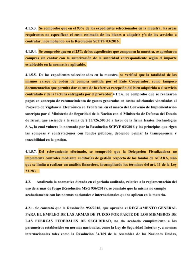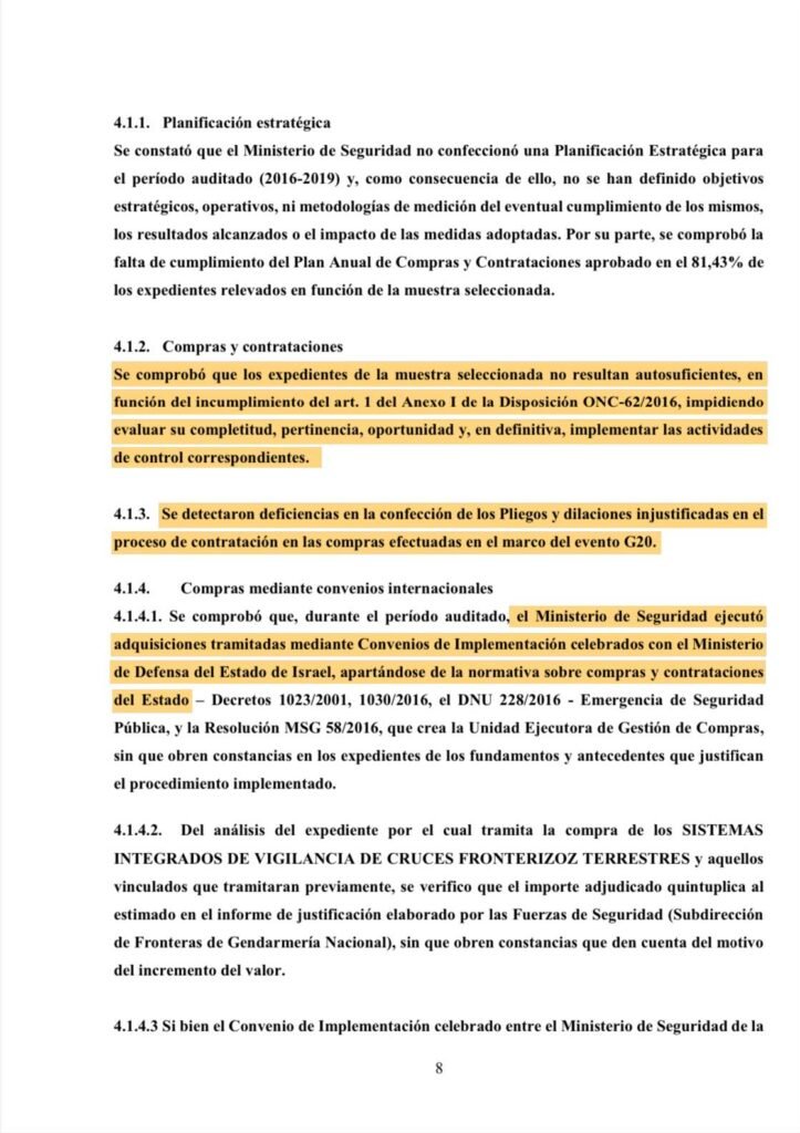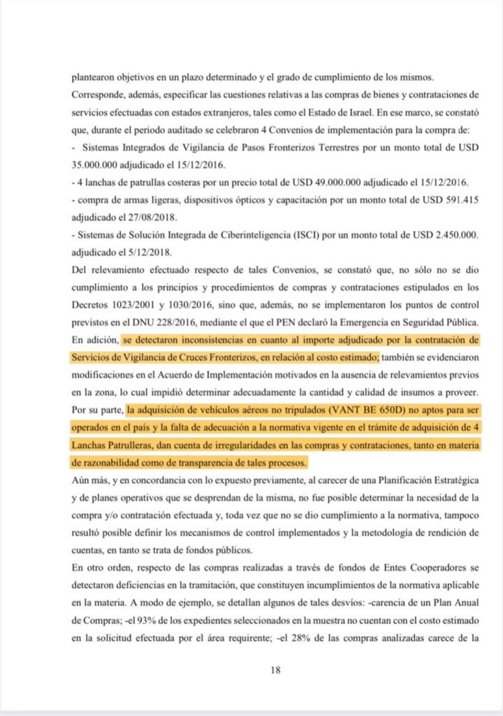El informe de la AGN expone cómo Bullrich aprovechó el Decreto de Emergencia de Seguridad (DNU 228/2016) para eludir controles. El caso más flagrante: la compra de equipamiento a Israel en 2016 por 90 millones de dólares, sin licitación.