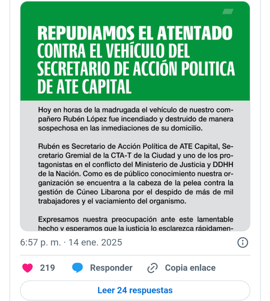 En horas de la mañana del martes, el vehículo particular de Rubén López, secretario Gremial de la seccional CABA de la CTA de los Trabajadores fue incendiado por individuos desconocidos.
