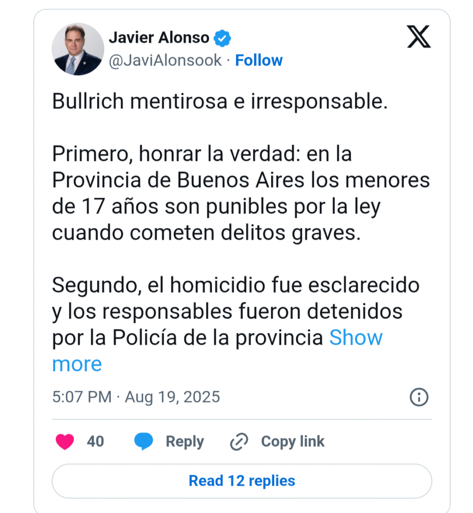Este martes, Alonso respondió a Bullrich desde la misma red social. “Bullrich mentirosa e irresponsable. Primero, honrar la verdad: en la Provincia de Buenos Aires los menores de 17 años son punibles por la ley cuando cometen delitos graves”, comenzó afirmando el funcionario bonaerense.