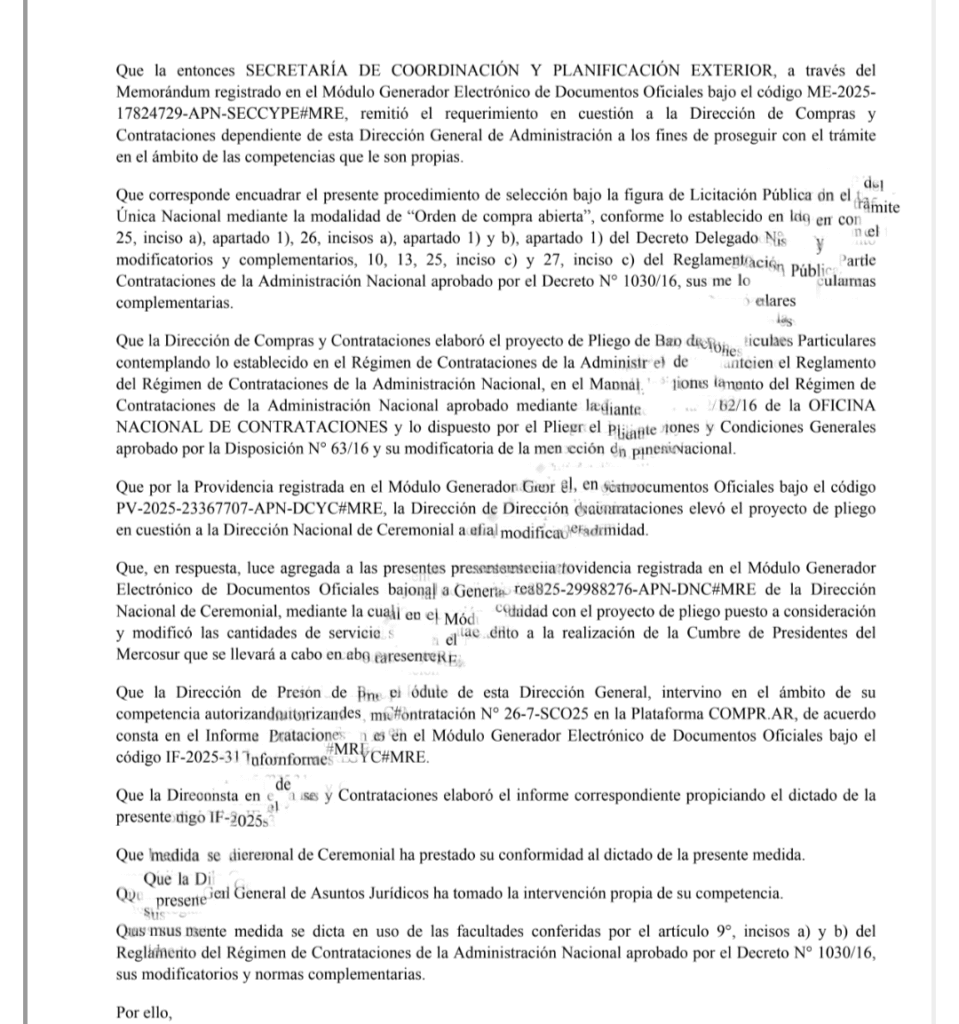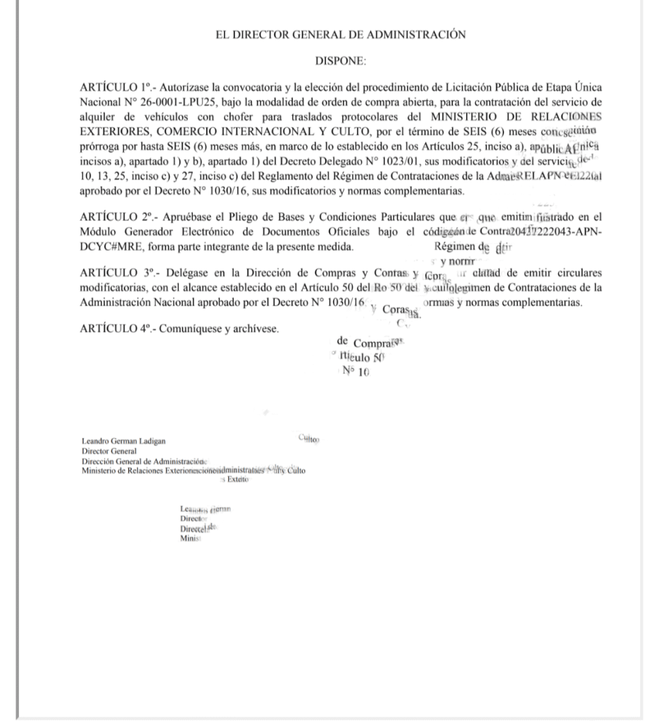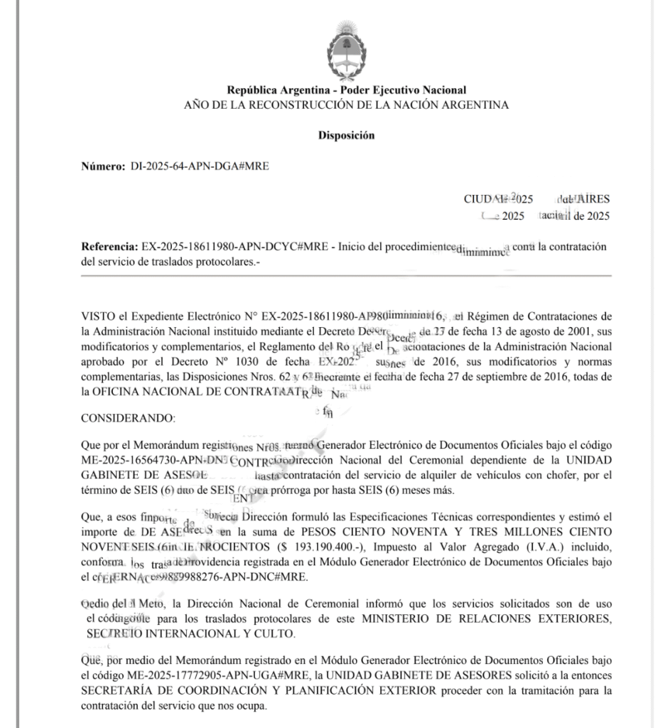 De acuerdo a la página de licitaciones públicas, la cartera del canciller elevó una solicitud para contratar un servicio de choferes por el lapso de seis meses que debe encargarse de trasladar al titular de alto rango ministerial a los eventos protocólales que vayan a darse en esos meses. La suma estimada para tal gustito es de 193.190.400 de pesos; aunque, claramente, al tratarse de una estimación podría variar de acuerdo a cuál oferta sea la confirmada.