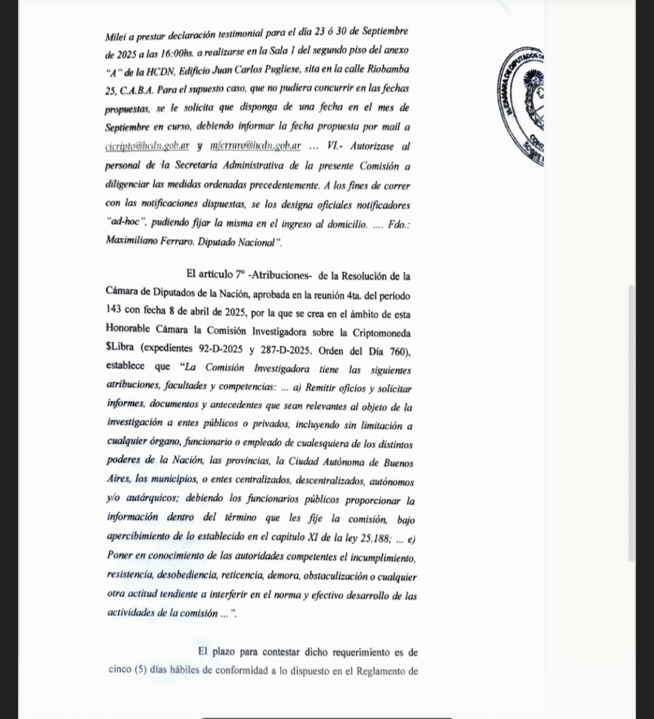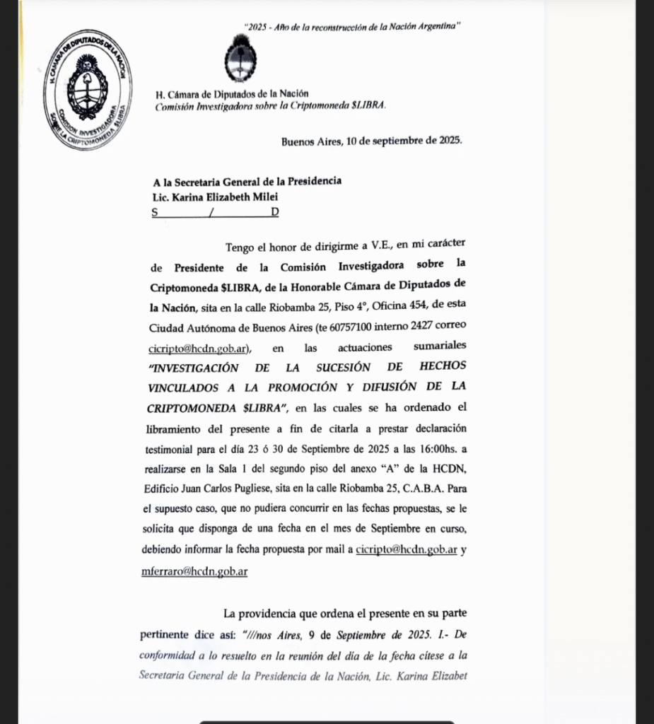 La comisión investigadora del escándalo de $Libra concretó la citación a la secretaria general de la Presidencia antes de octubre. También reclamó información a la Justicia, a la Jefatura de Gabinete, a X.Corp y a exchanges, y advirtió que podría recurrir a la fuerza pública si la funcionaria no declara.