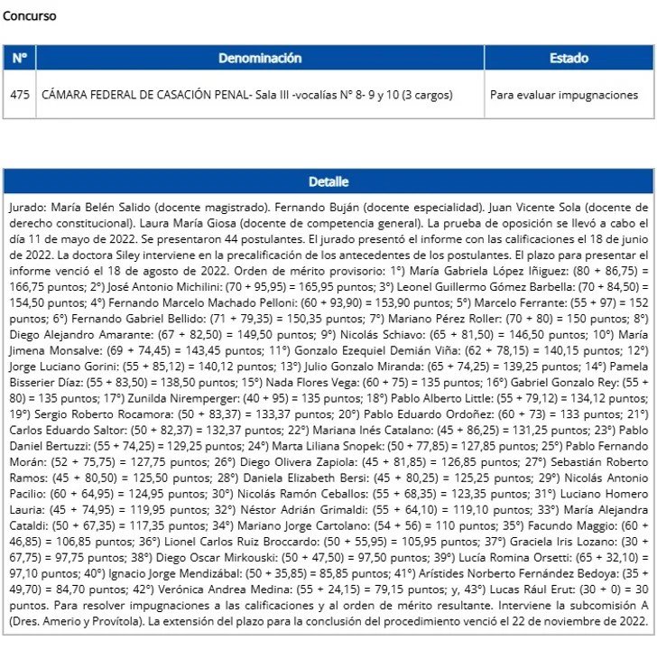 Justamente, uno de los concursos que está allí pendiente es el 475, para ocupar tres cargos en la sala III de la Cámara. La terna aún no está resuelta y un apoyo del Gobierno podría generar que el magistrado integre alguna de las ternas que se envíen al Poder Ejecutivo. Después de eso, no es necesario que sea el de mayor puntaje: el presidente puede enviar al Senado el pliego de cualquiera de los tres candidatos para el puesto.