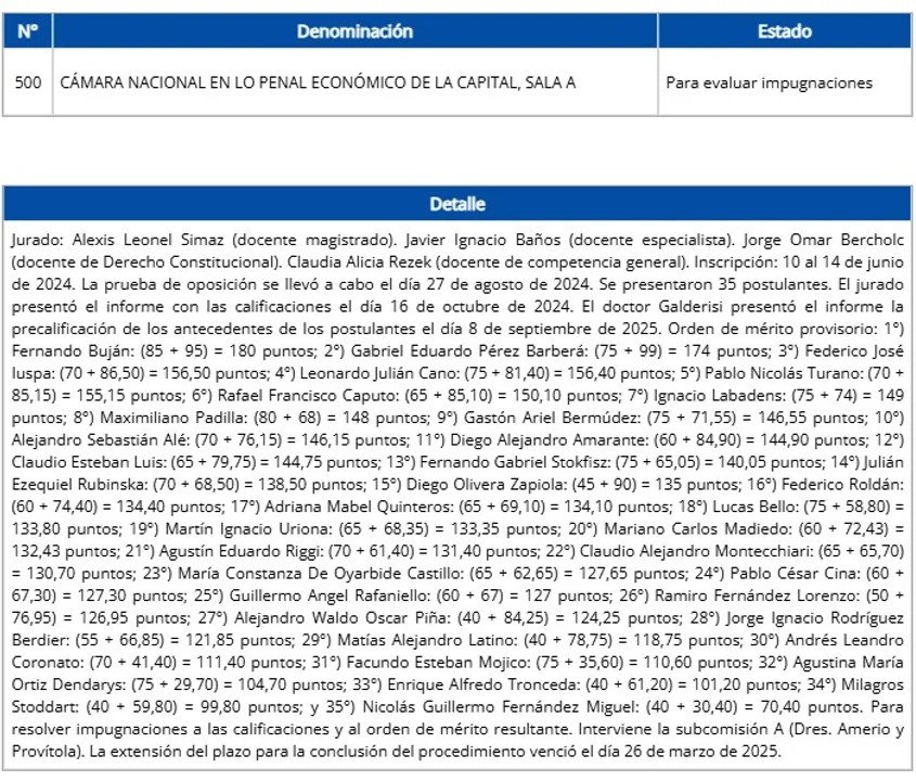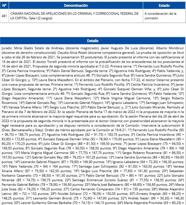 Cabe resaltar que Amarante también está en lugares expectantes para otros dos concursos: uno por dos cargos en la Cámara Federal de Comodoro Py y otro por un puesto en la Cámara de Apelaciones en lo Penal Económico.