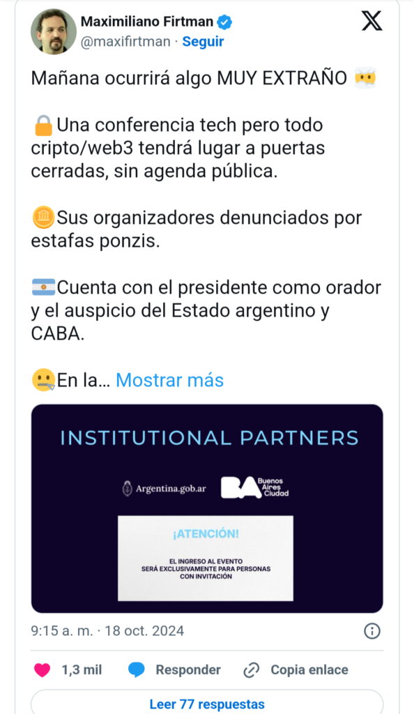 La polémica ya se desató entonces por un condimento más: lo opaco del currículum de la empresa organizadora, Tech Forum SRL. Fue creada apenas dos meses antes del evento por el trader Mauricio Novelli y Manuel Terrones Godoy, un youtuber del mundo de los NFTs games.