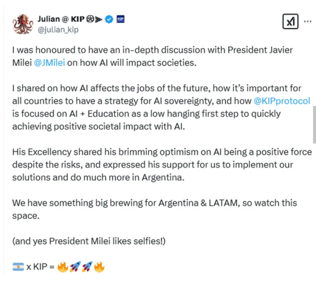 Además de la audiencia, hay un registro fotográfico: una selfie que el propio Peh compartió al día siguiente. “Su Excelencia (sic) compartió su rebosante optimismo sobre que la IA sea una fuerza positiva a pesar de los riesgos, y expresó su apoyo para que implementemos nuestras soluciones y hagamos mucho más en Argentina”, tuiteó el fundador de KIP Protocol.
