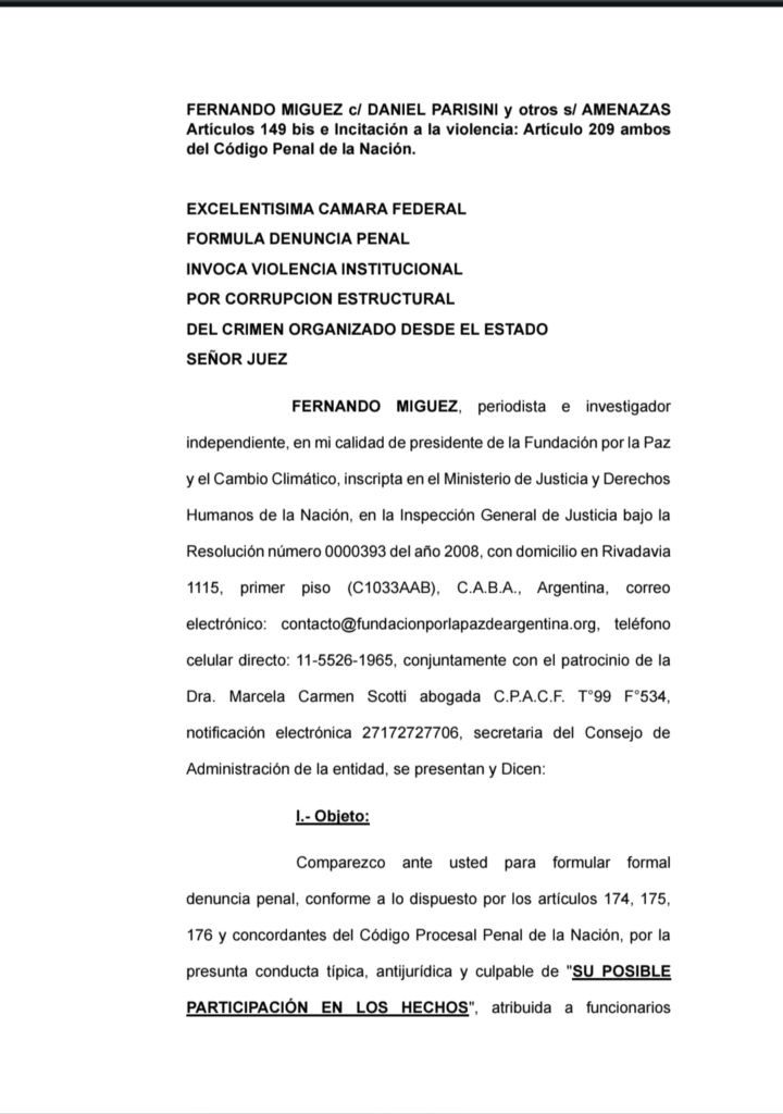 La Fundación por la Paz y el Cambio Climático, presidida por Míguez, invoca “violencia institucional” y señala un entramado de “corrupción estructural del crimen organizado desde el Estado”, elevando la gravedad del caso a un nivel nacional e incluso internacional.