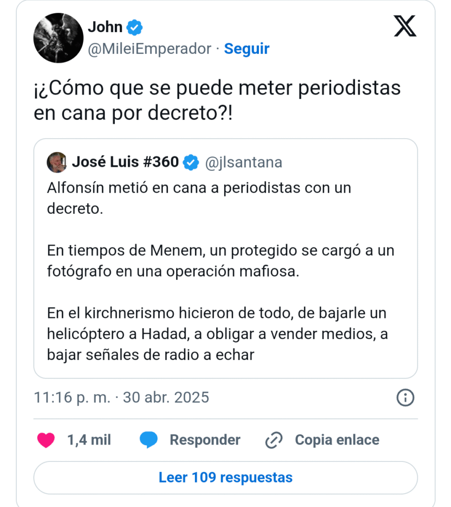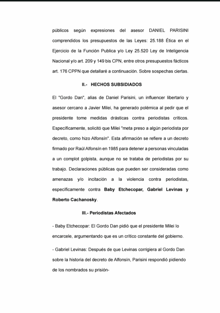 Según la denuncia, Parisini pidió abiertamente que Milei “meta preso a algún periodista por decreto, como hizo Raúl Alfonsín”, en un intento por silenciar a voces críticas del Gobierno.