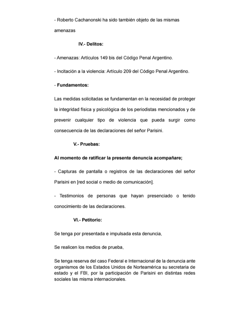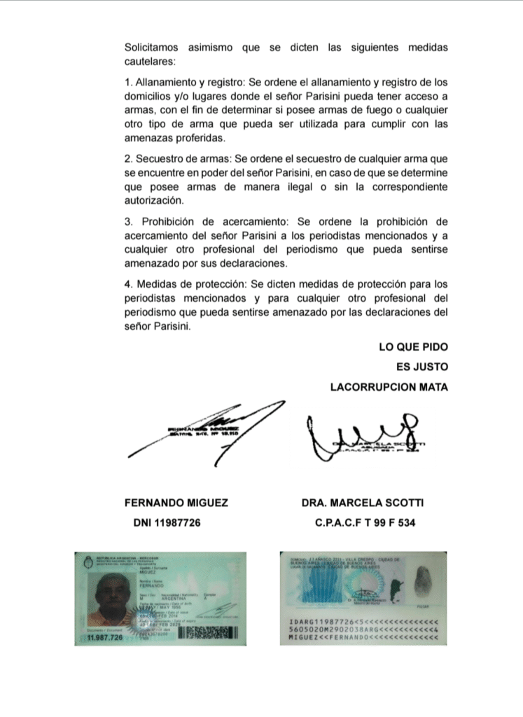 El denunciante solicita que se investigue si Parisini tiene acceso a armas de fuego y exige medidas cautelares como allanamientos, secuestro de armas, y la prohibición de acercamiento a los periodistas mencionados.