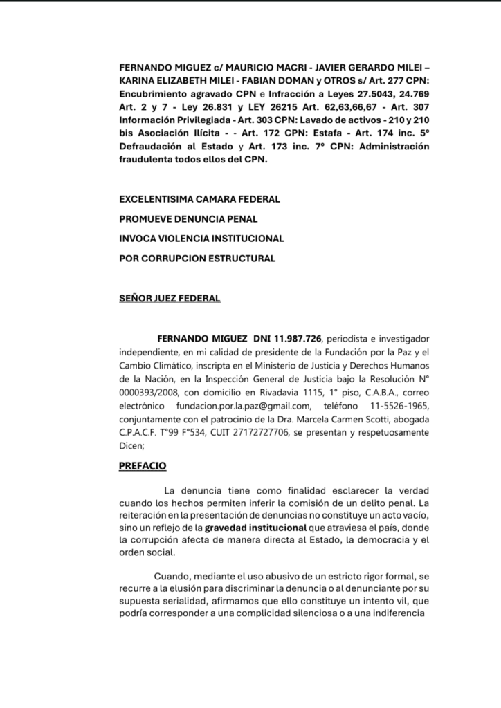 El periodista e investigador Fernando Míguez, presidente de la Fundación por la Paz y el Cambio Climático, presentó una denuncia penal contra Mauricio Macri, Javier Milei, Karina Milei, Fabián Doman y otros dirigentes por presuntos delitos de encubrimiento agravado, lavado de activos, asociación ilícita, defraudación al Estado y administración fraudulenta.