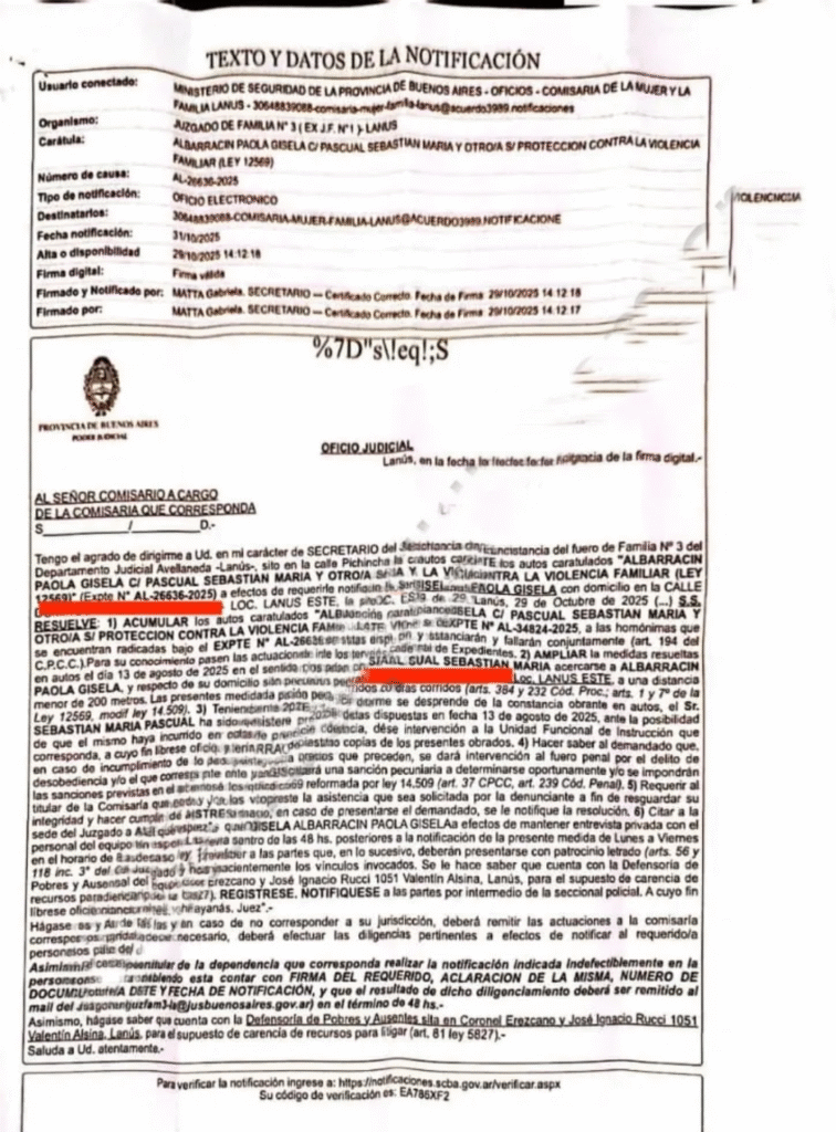 La medida se originó tras la acumulación de dos expedientes –AL-26636-2025 y AL-34324-2025– en los que se investigan distintos episodios de hostigamiento y amenazas contra Albarracín. Según el texto judicial, se ordenó además notificar a la comisaría correspondiente para garantizar el cumplimiento efectivo de la perimetral.