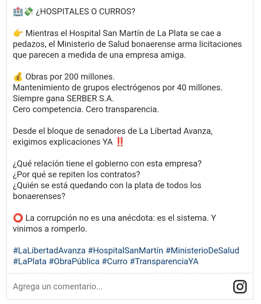 “Desde el bloque de senadores de La Libertad Avanza, exigimos explicaciones YA. ¿Qué relación tiene el gobierno con esta empresa? ¿Por qué se repiten los contratos? ¿Quién se está quedando con la plata de todos los bonaerenses? La corrupción no es una anécdota: es el sistema. Y vinimos a romperlo”, sentenció en sus redes sociales