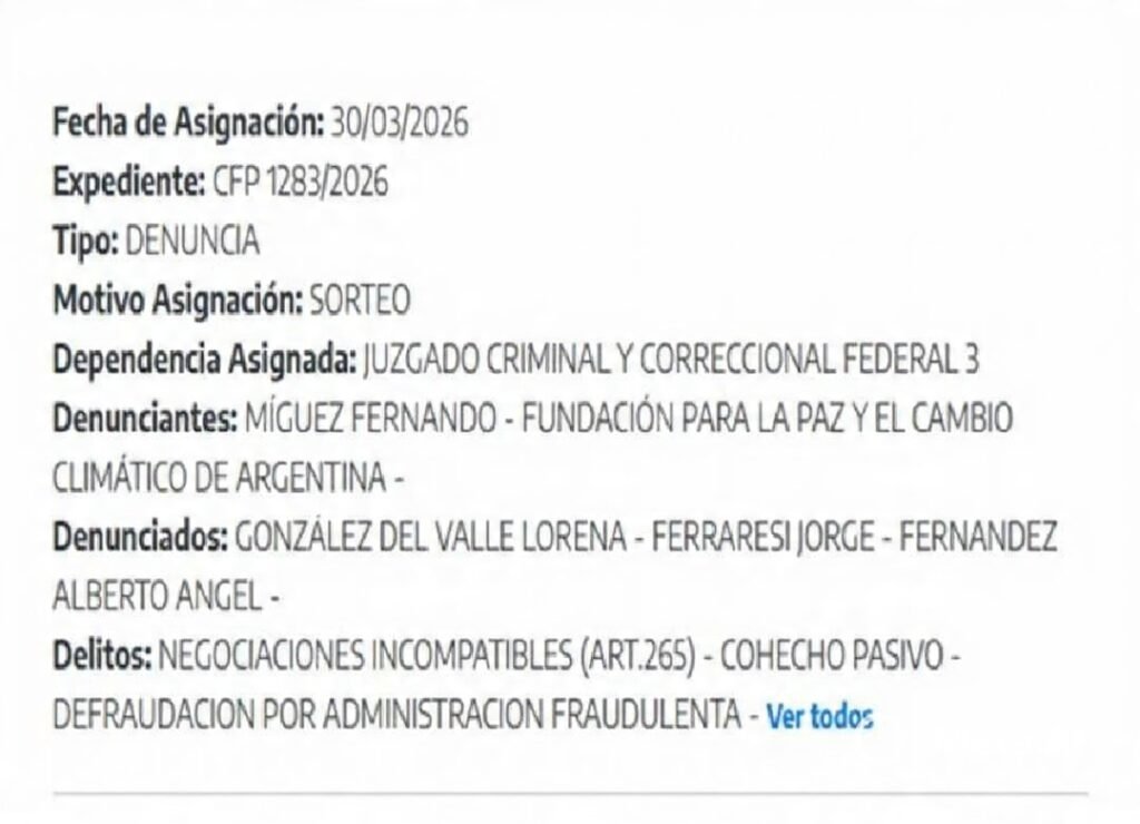 La presentación fue realizada por el periodista Fernando Míguez, en su carácter de presidente de la Fundación para la Paz y el Cambio Climático de Argentina, quien solicitó que se investiguen delitos como negociaciones incompatibles con la función pública, cohecho pasivo, administración fraudulenta, abuso de autoridad y malversación de caudales públicos.