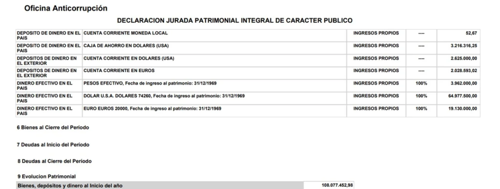 En su declaración jurada presentada en enero de 2024 ante la Oficina Anticorrupción, Cifelli incluyó cifras que no pasan desapercibidas. Más del 80% de su patrimonio declarado —unos 87 millones de pesos— está en efectivo o en cuentas bancarias en moneda extranjera, buena parte depositados fuera del país: