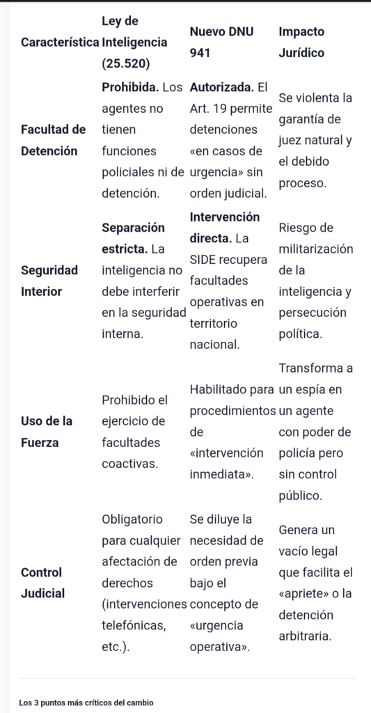 Desde el regreso de la democracia, Argentina mantuvo una separación tajante: quienes hacen inteligencia no pueden hacer seguridad. Esto es para evitar que los servicios secretos se conviertan en una «policía política». El DNU 941 borra esa línea, permitiendo que quienes manejan información reservada también tengan el poder de esposar a un ciudadano.