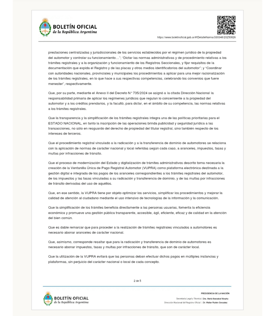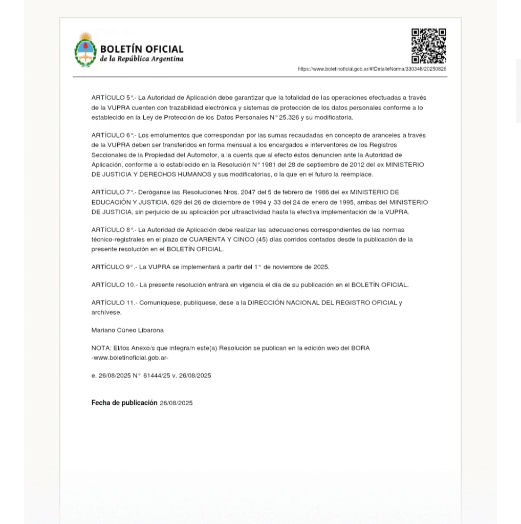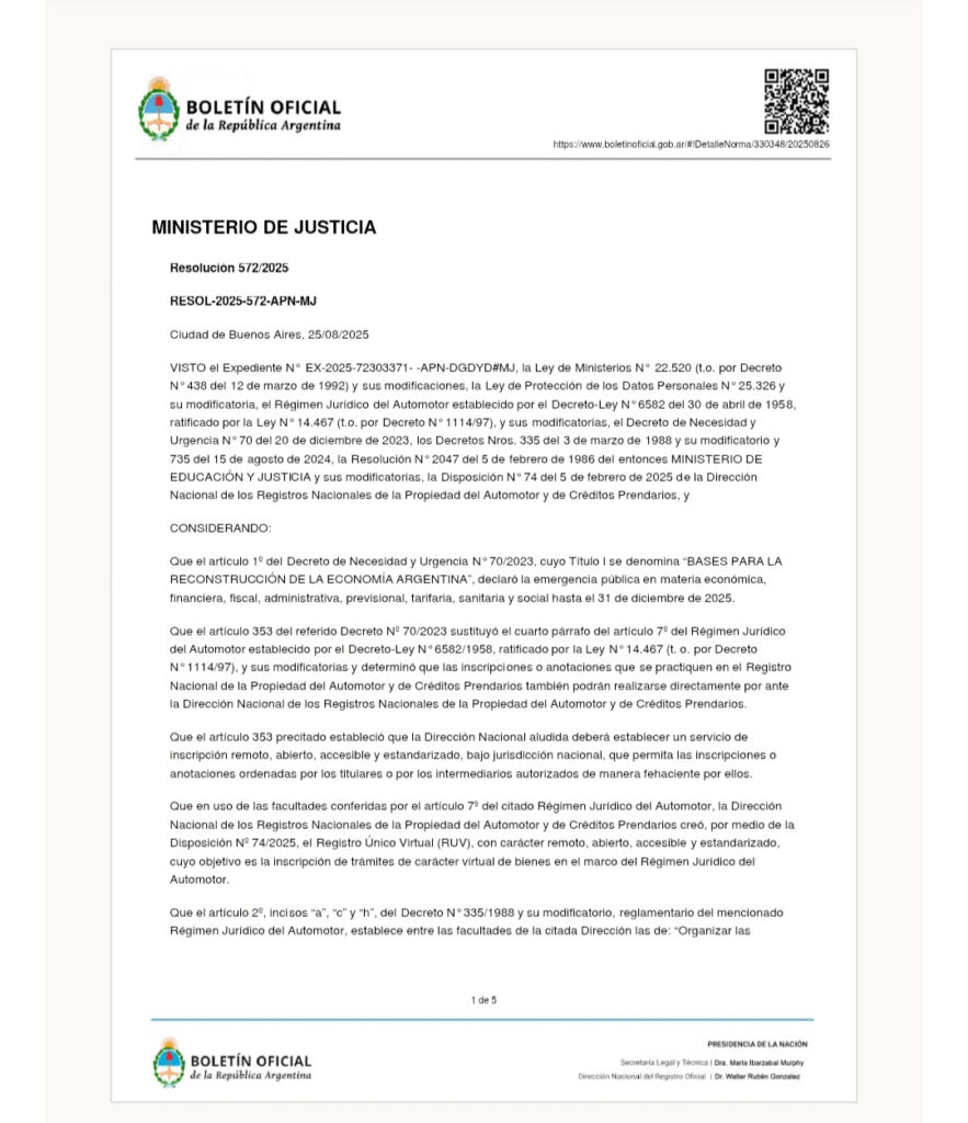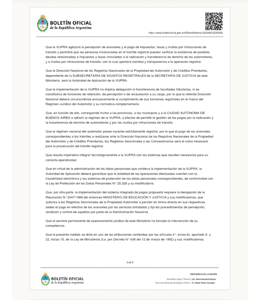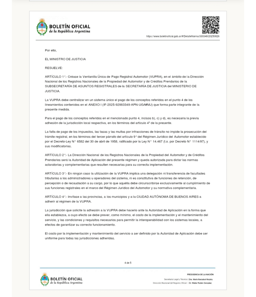 Mariano Cúneo Libarona dispuso dos meses atrás que a partir del 1 de noviembre se implemente una Ventanilla Única de Pago Registral Automotor (VUPRA). La resolución 572/2025 se publicó el 13 de octubre, pero fue escrita el 28 de agosto pasado.
